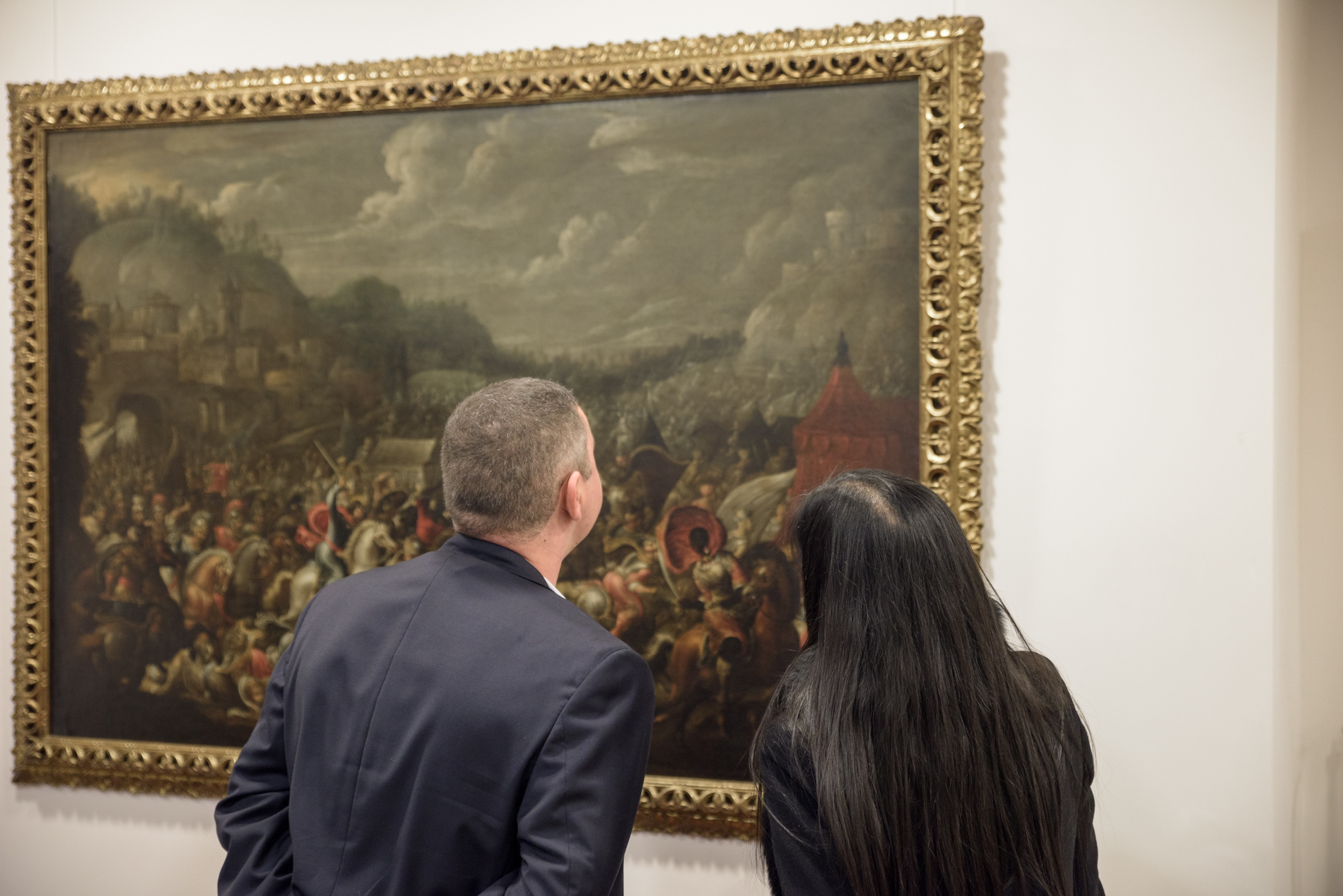 Entre todas estas piezas destaca un interesante óleo realizado entre los últimos años del siglo XVI y los primeros del XVII, en el que se representa una perspectiva muy detallada del conjunto arquitectónico del Real Monasterio de San Lorenzo de El Escorial, complejo arquitectónico ideado por Felipe II para convertirse en la sepultura del cuerpo de su padre, el emperador Carlos V. Construido entre 1563 y 1584, inicialmente el proyecto fue pensado por el arquitecto Juan Bautista de Toledo, el cual diseñó un magno edificio de planta regular y simétrica, una estructura que continuó Juan de Herrera al ser nombrado nuevo director de las obras. El resultado fue un enorme complejo urbanístico que ya durante su construcción causó asombro, admiración y curiosidad entre sus contemporáneos, tanto españoles como del resto de Europa, convirtiéndose en uno de los grandes hitos de la arquitectura mundial de la época moderna, hasta el punto de ser nombrado la “Octava maravilla del Mundo”.